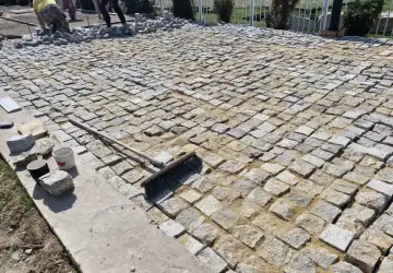 За счёт структуры камня мощение получается визуально неоднородным и сохраняет характерную фактуру на всей площади, что отличает его от более обработанных вариантов.