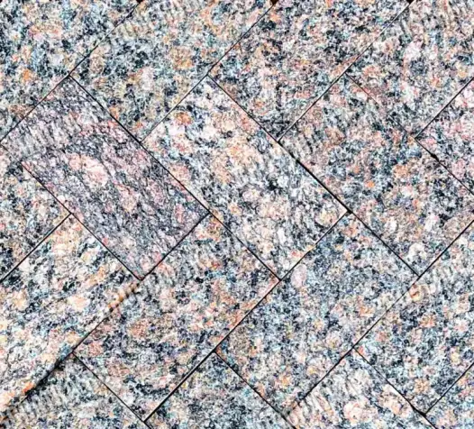 Красногорский гранит (также известен как Балтийский) отличается многоцветной структурой с преобладанием красно-чёрных оттенков и включениями светлых зёрен. За счёт этого покрытие выглядит насыщенно, но сохраняет аккуратный и упорядоченный вид при мощении.